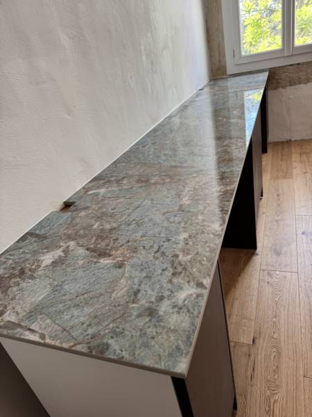 La dalle Amazonite est inspirée de la pierre précieuse amazonite. Avec sa couleur vert d’eau et ses mouchetures brunes, cette pièce est unique grâce à sa couleur verdâtre, ses reflets bleus et ses taches brunes.
