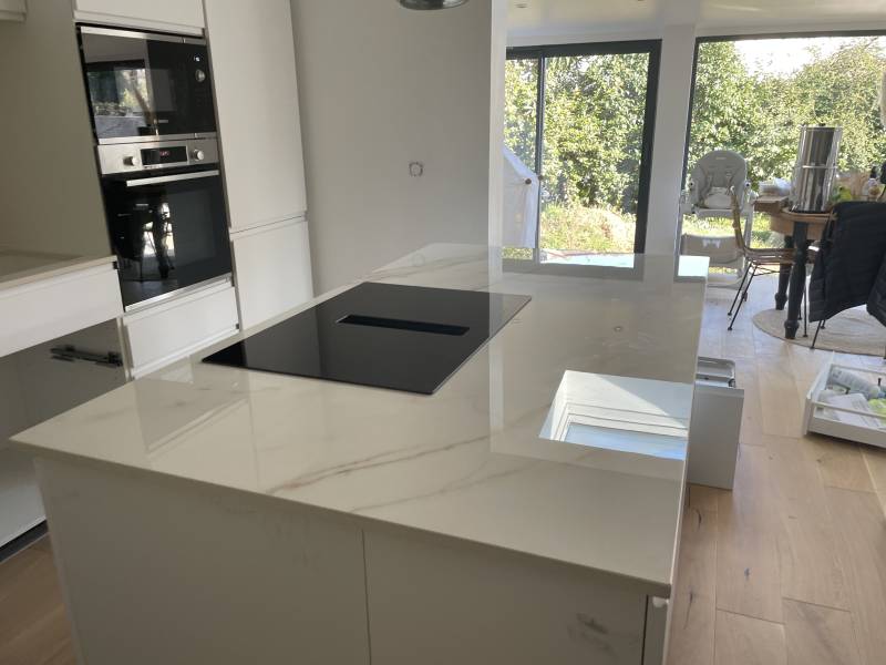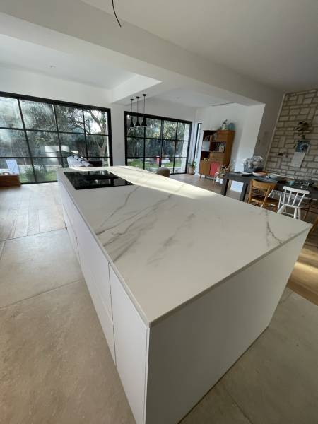 Calacatta Gold : La nuance du blanc dans cette dalle devient légèrement chaude grâce aux reflets dorés, les veines sont fines et délicates, dont le résultat final est un effet marbre sobre, polyvalent et extrêmement élégant.