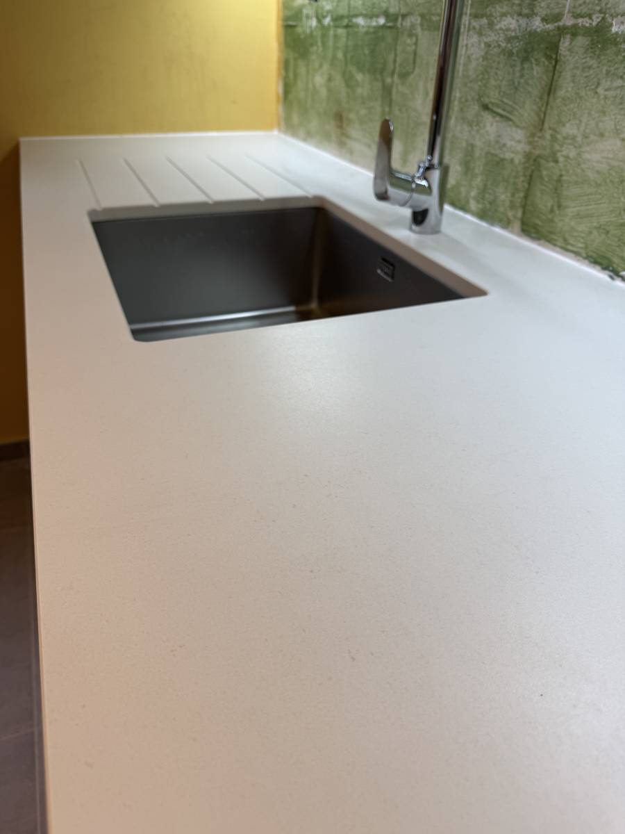 La cuve sous plan assure une continuité parfaite de la surface, tandis que le rainurage intégré apporte une touche discrète et pratique, pensée pour un usage quotidien.