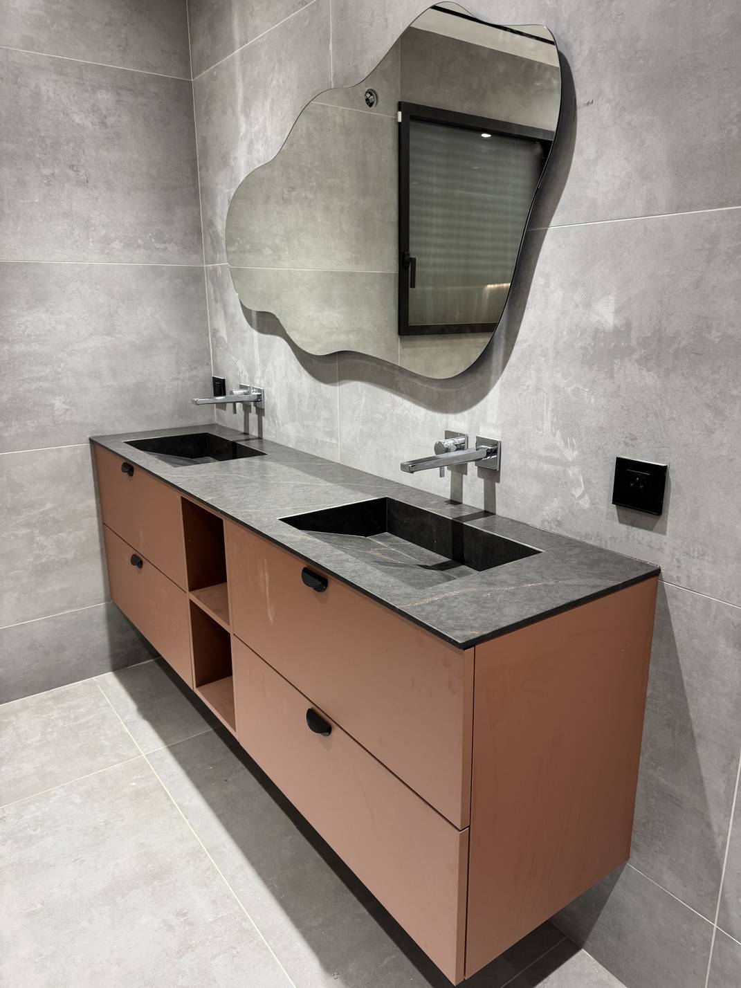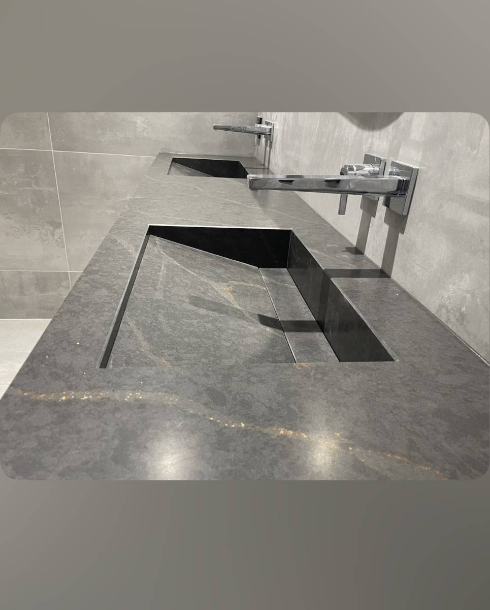 On vous présente cette magnifique réalisation : un double plan vasque sur mesure, modèle SIMPLICITY en Quartz Silestone Bohemian Flame signé Cosentino.